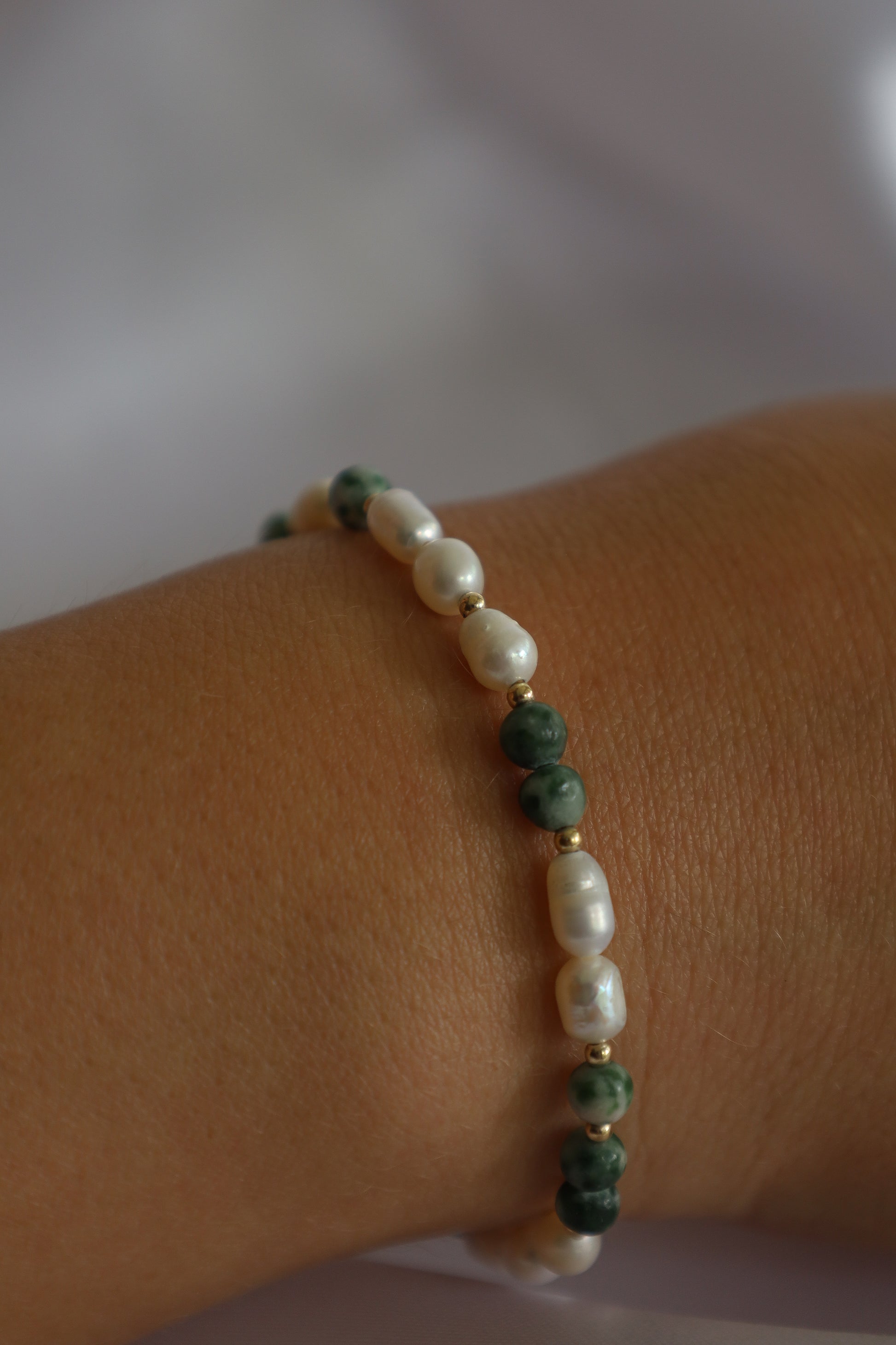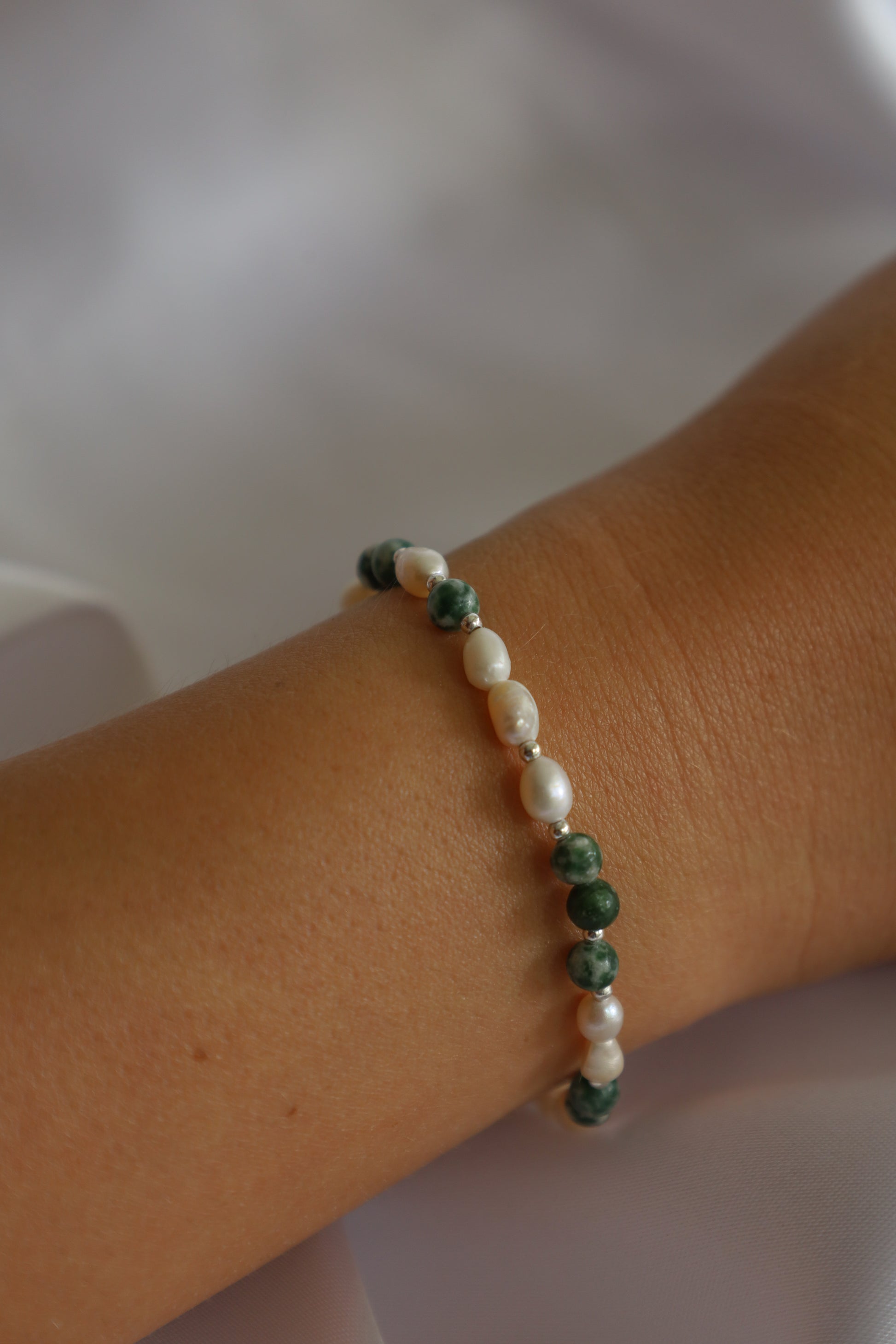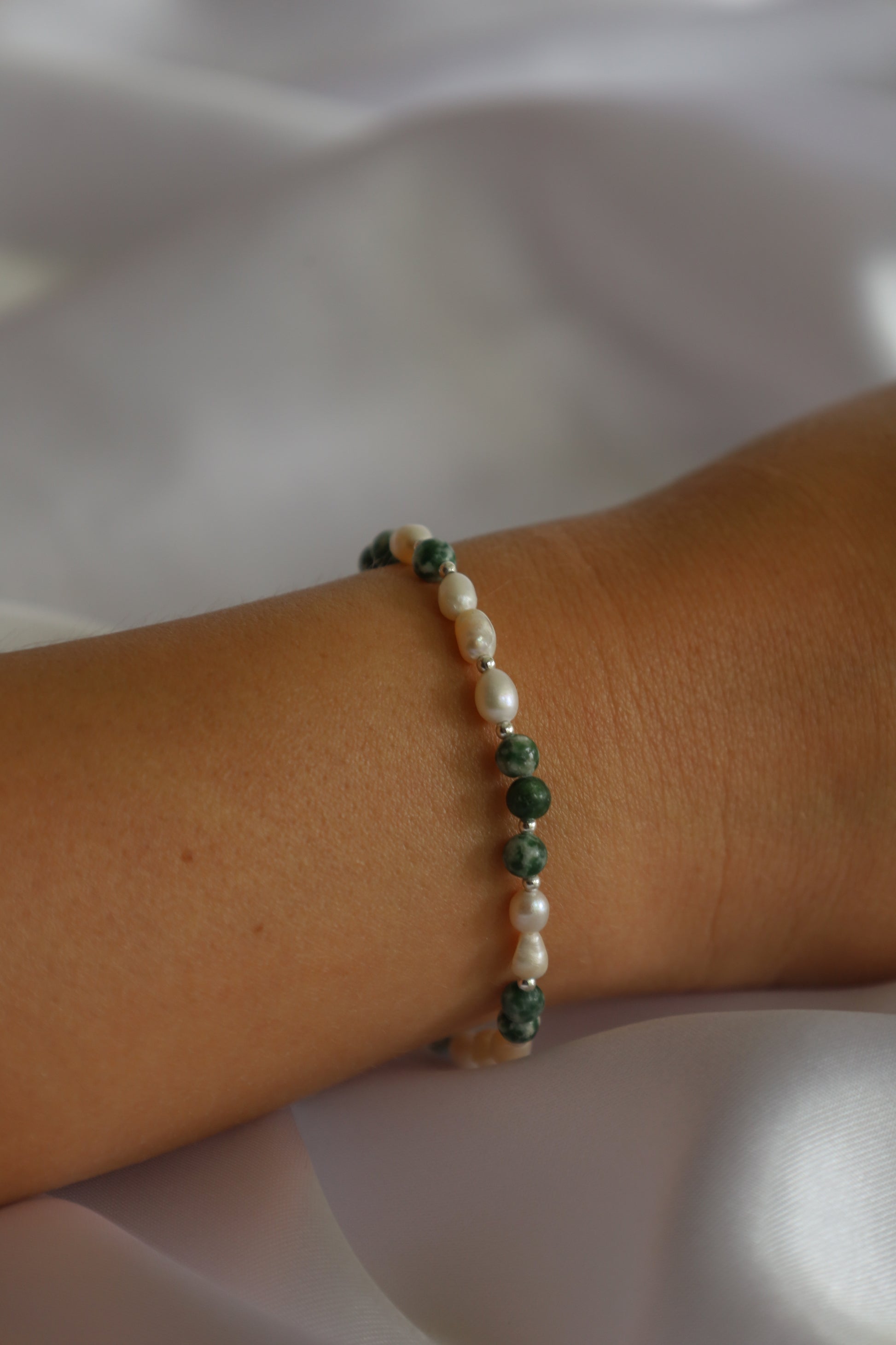 צמיד עדין מאבני חן אגט בצבע ירוק ופניני מים מתוקים טביעות